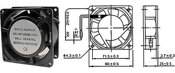 Ventilátor 230VAC, 80x80x25mm, 14W, 21m3/hod, 29dBA.