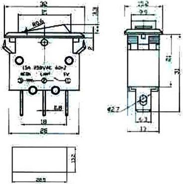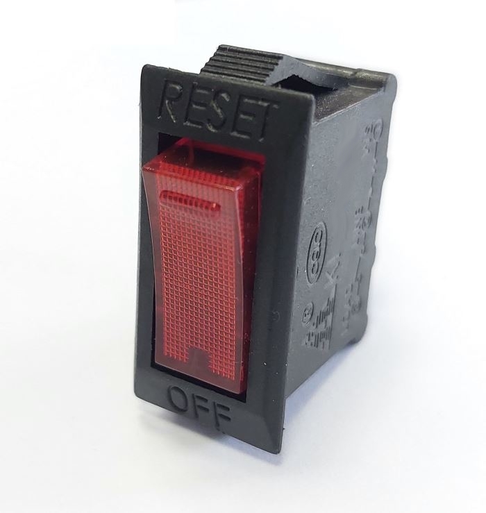 Kolébkový spínač s aretací v krajních polohách 15A/250VAC, 2x spínací kontakt, s vestavěným jističem 15A