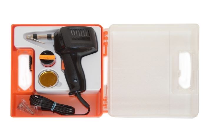 Balení obsahuje: pistolovou páječku, sadu 5-ti ks náhradních smyček, kalafunu a cínovou pájku.