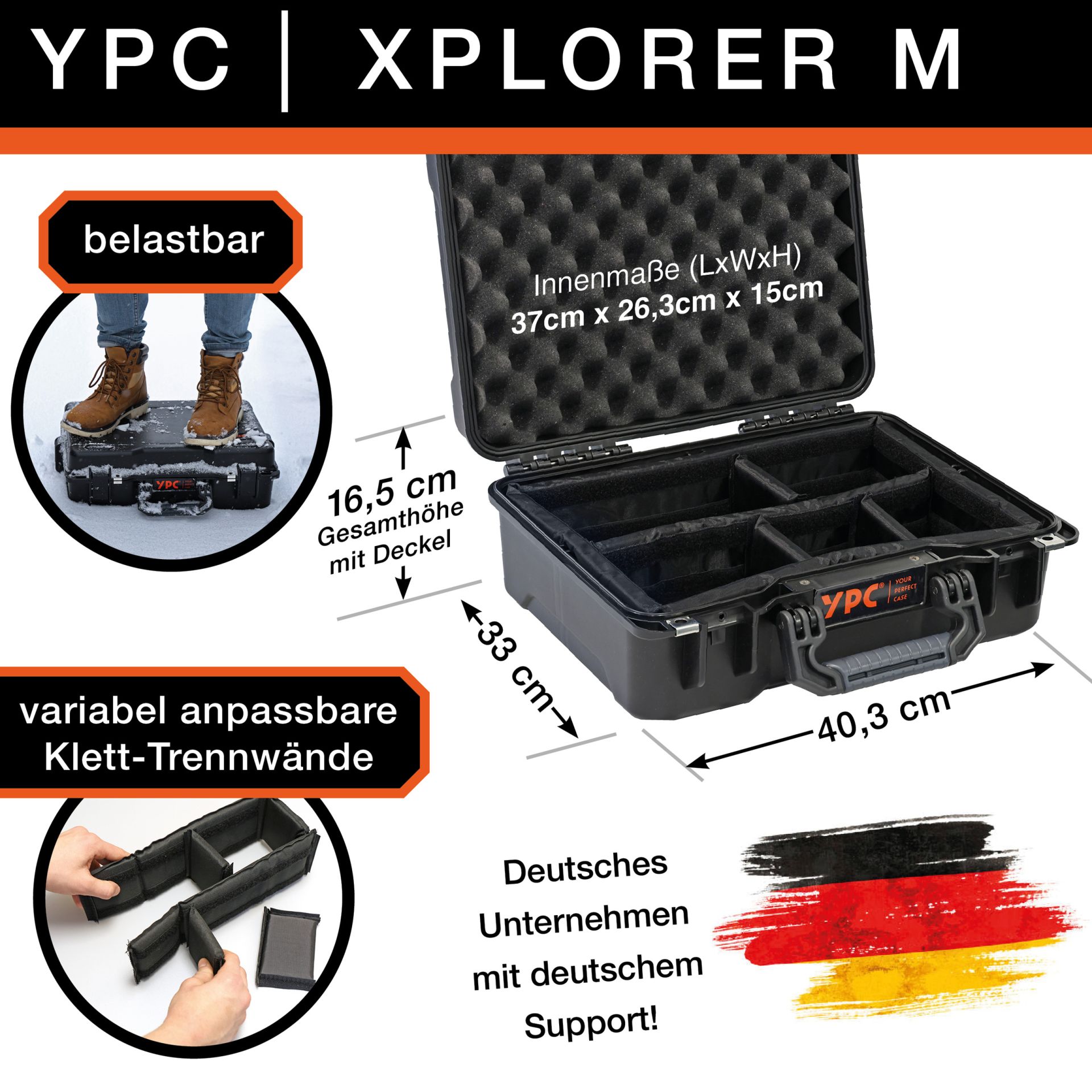 STŘEDNÍ ROZMĚRY: Case M se dodává ve střední velikosti o šířce 40 cm, hloubce 33 cm a výšce 16,5 cm. Vnitřní rozměry jsou 37 cm na šířku, 26,3 cm na hloubku a 15 cm na výšku.