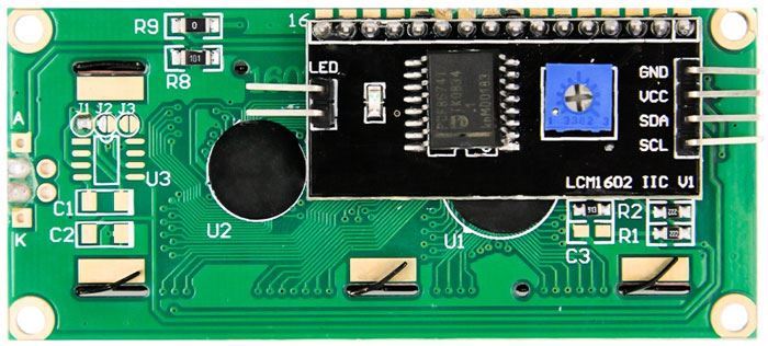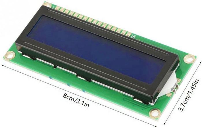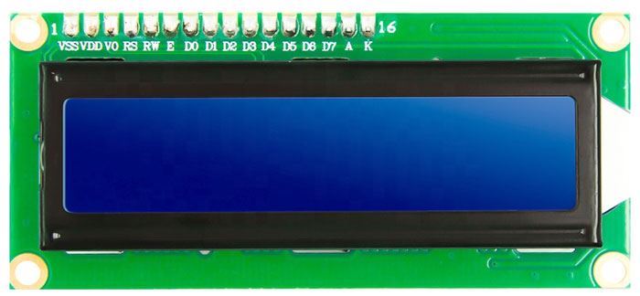 Displej 16x2 na sběrnice I2C, modré podsvícení, bílá písmena.