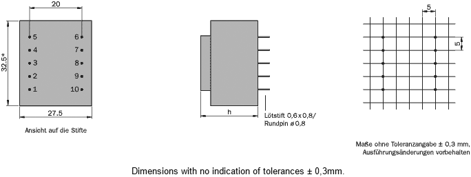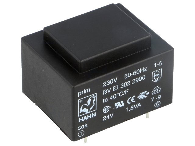 Transformátor 1.8VA, 230VAC/24VAC-75mA, zalitý, piny do plošného spoje