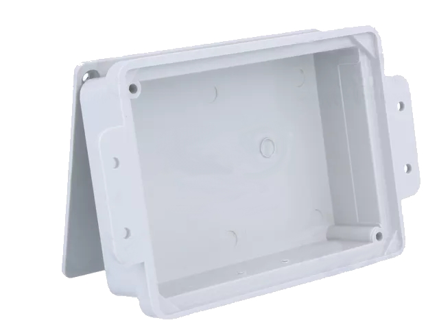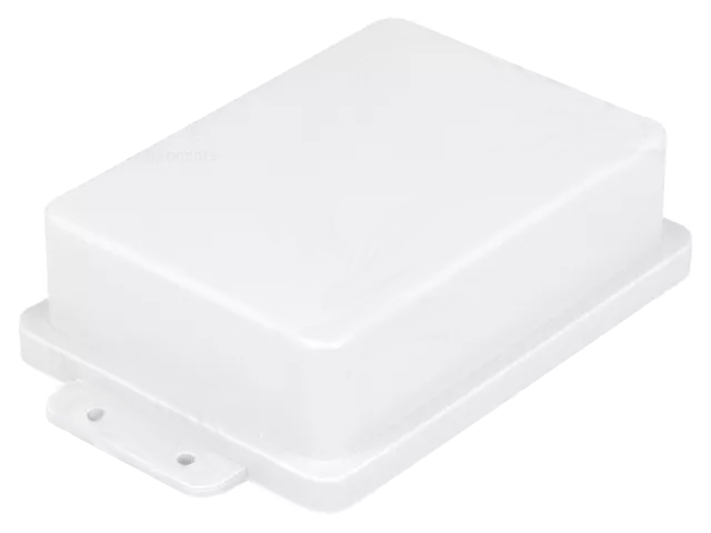 Plastová krabička s bočními příchytkami pro přišroubování na stěnu bez bočního otvoru.
