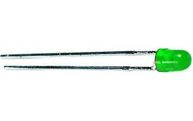 LED dioda 3mm zelená 565nm rozptylná 35° 2mcd 2mA Uf 1.8V