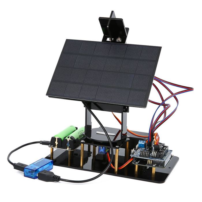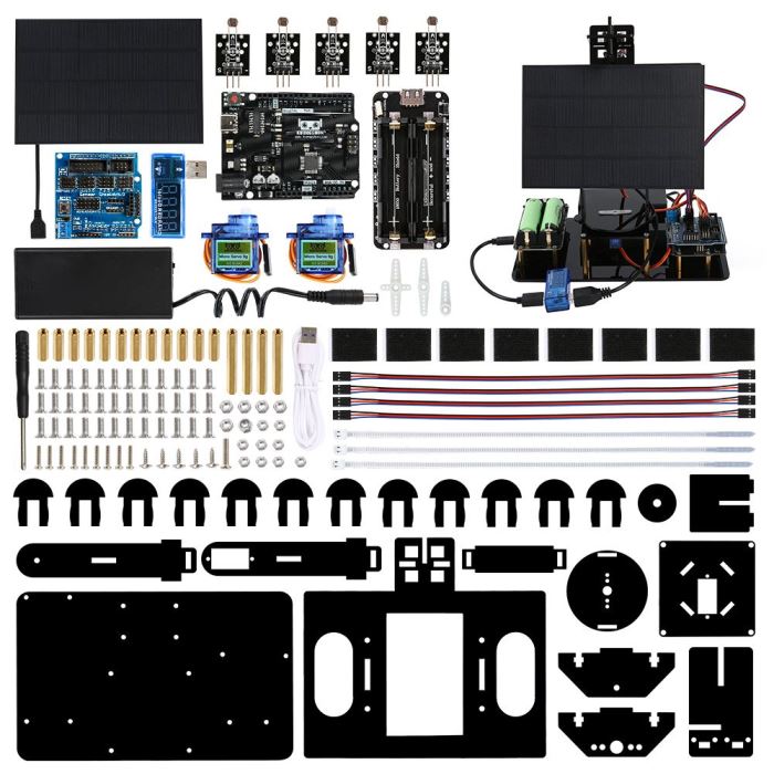 Sada je komplexní balíček obsahující základní komponenty, jako je solární panel, nabíjecí deska, řídicí jednotka Arduino, servomotory a další.