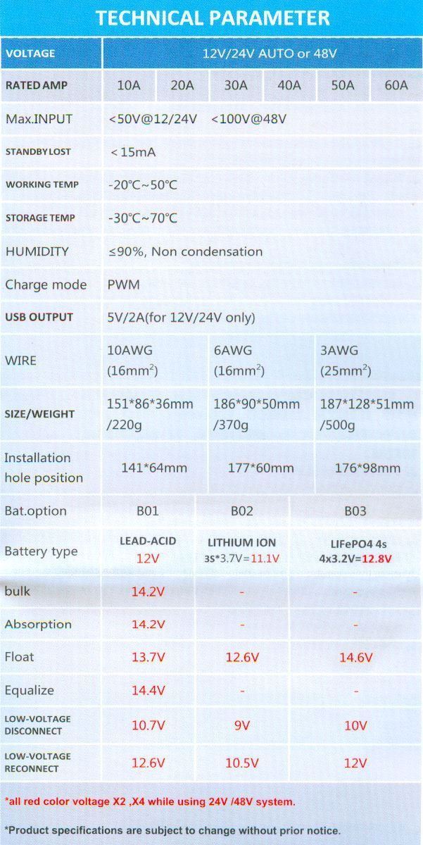 Regulátor je vhodný pro olověné baterie (plovoucí, AGM, GEL), lithium iontové a LiFePO4